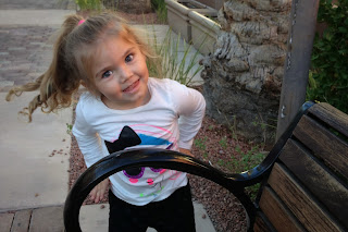 ...after dinner, the girls took a drive around the block and checked out some awesome Halloween decorations on the street over from ours. Grace is the funniest driver. Whenever she is coming close to hitting something, even a curb, she stops and asks me to help her steer away from it. I had to keep telling her to push the peddle and steer at the same time. On the way home, I let her put it into the fastest gear and drive around a little cul-de-sac at the top of our street. Whenever she would stop, it would spin out, and she thought it was hilarious.